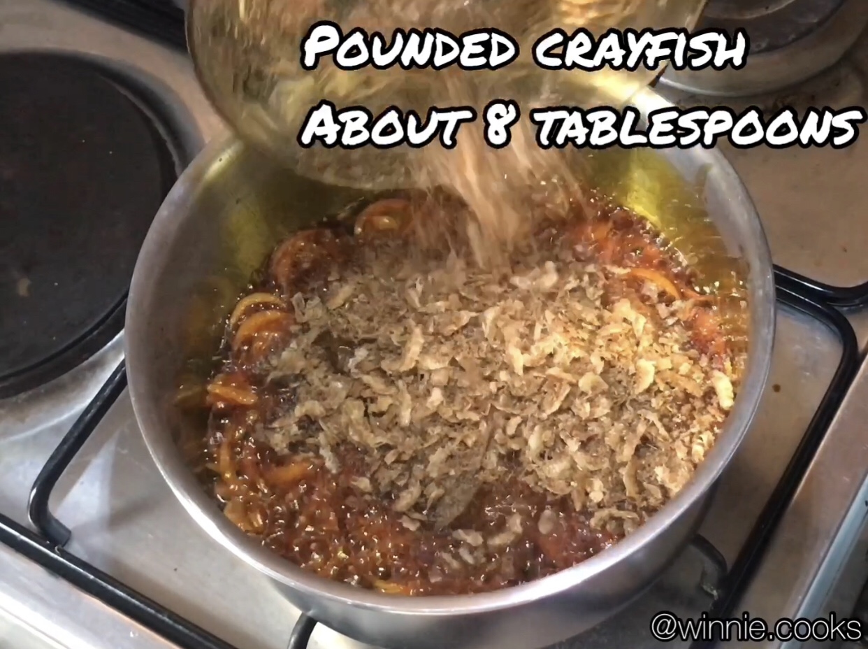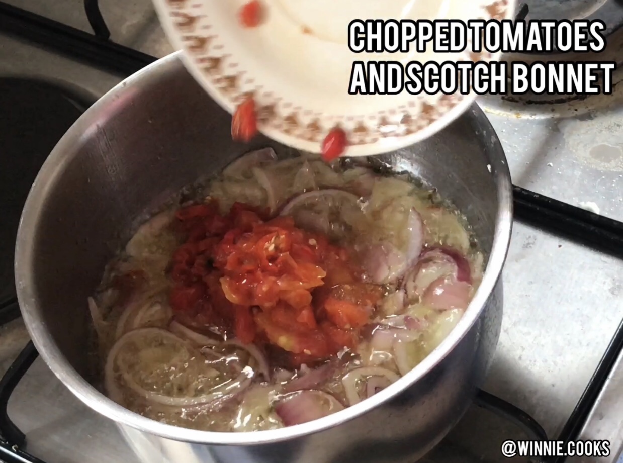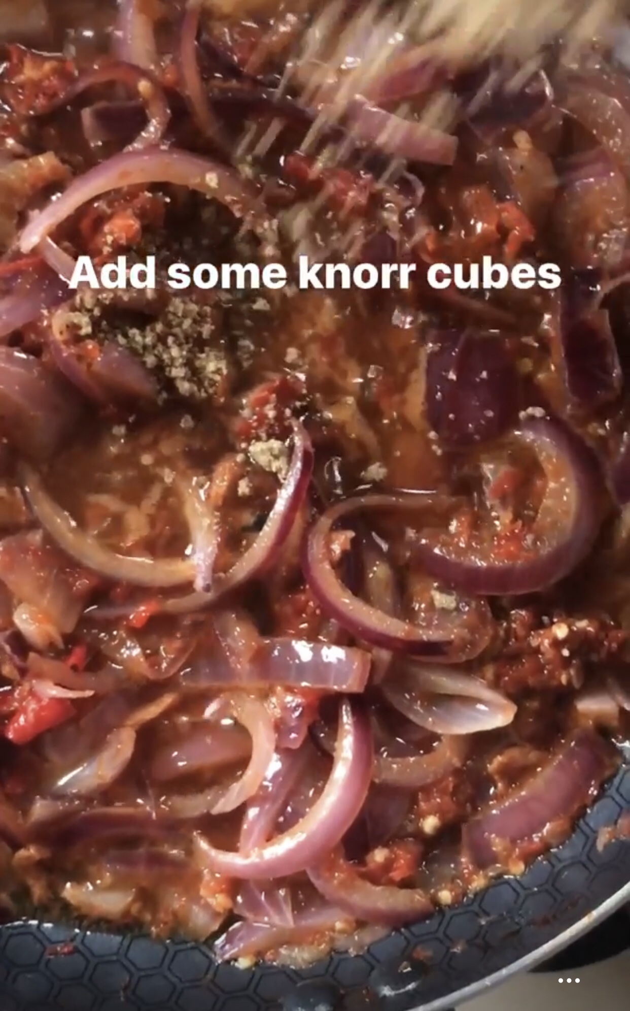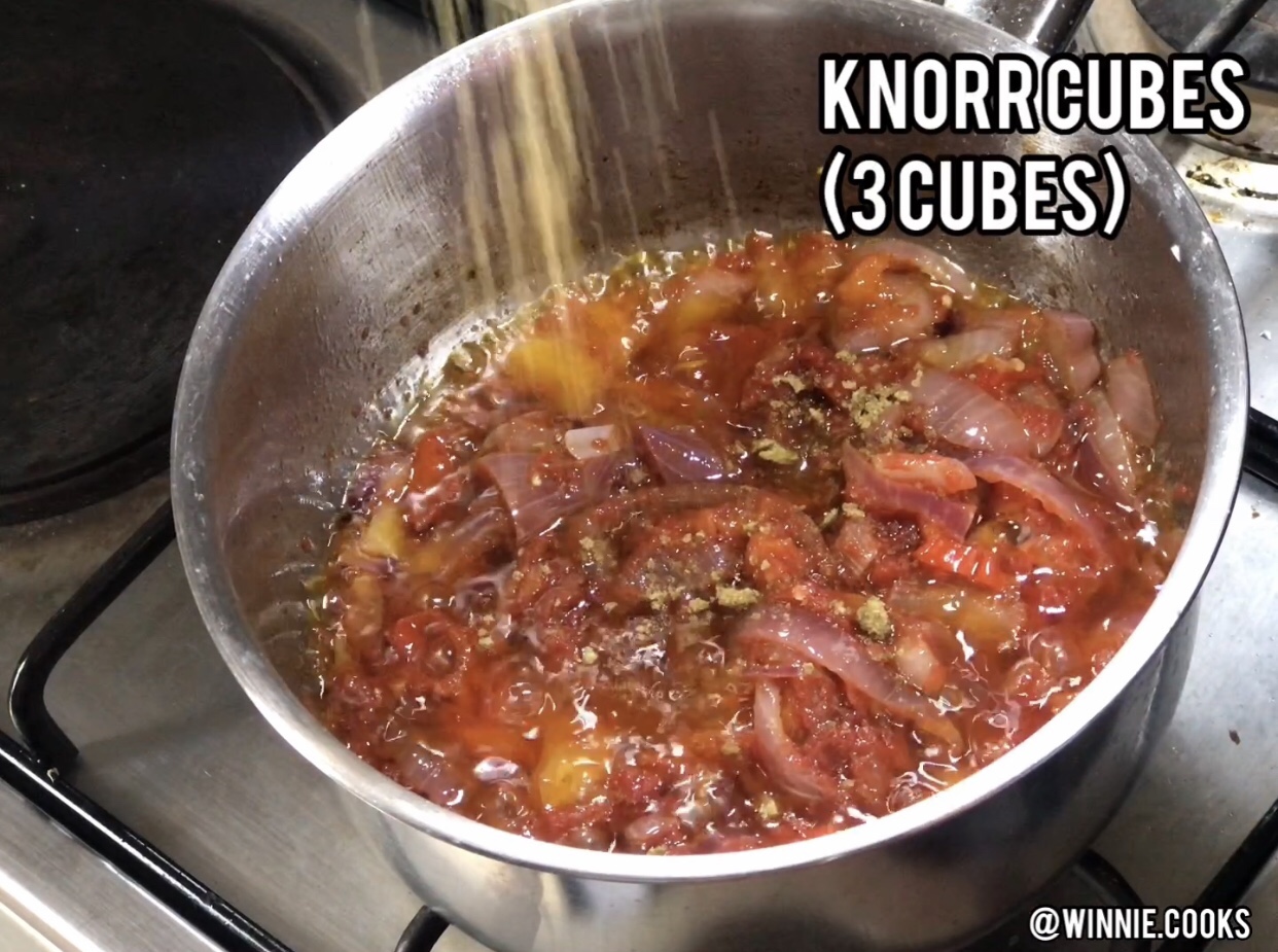 10. Add pounded scotch bonnet and knorr seasoning cubes. Fry until you are sure that any leftover water from the pepper blend has dried out. A good sign would be to see the oil floating at the top.