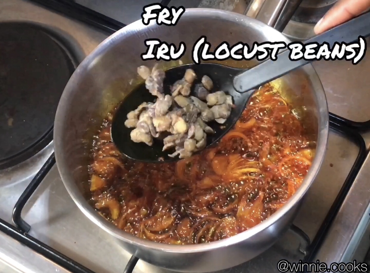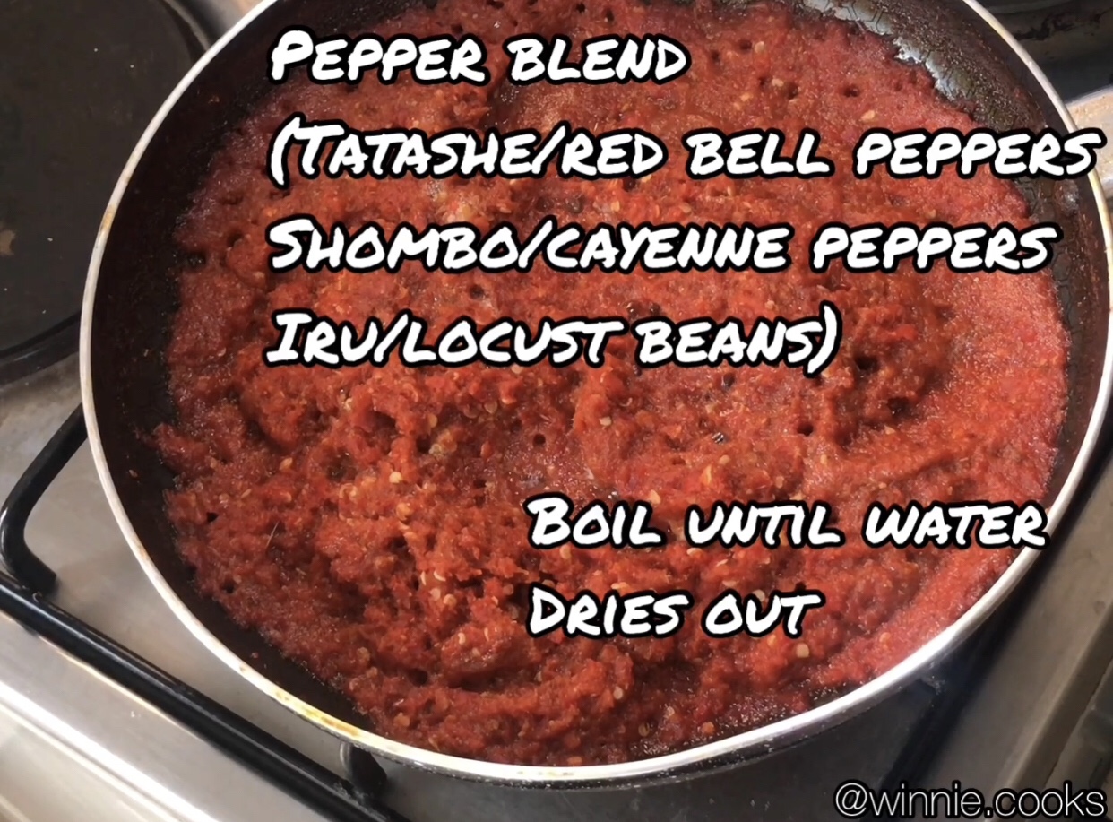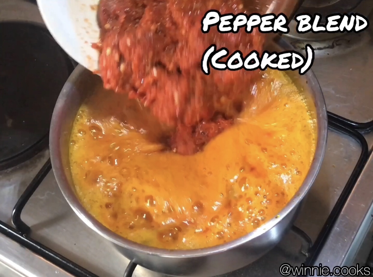 Note: Blend red bell peppers, cayenne peppers and half portion of the locust beans together.